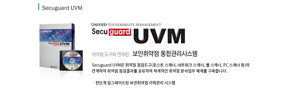 ÅëÇÕº¸¾ÈÃë¾àÁ¡ °ü¸®½Ã½ºÅÛÀÎ Secuguard UVM(Unified Vulnerability Management System)Àº Ãë¾àÁ¡ Á¡°Ëµµ±¸(È£½ºÆ® ½ºÄ³³Ê, ³×Æ®¿öÅ© ½ºÄ³³Ê, À¥ ½ºÄ³³Ê, PC½ºÄ³³Ê µî)¿Í ¿¬°èÇÏ¿© Ãë¾àÁ¡ Á¡°Ë°á°ú¸¦ °øÀ¯ÇÏ¿© ü°èÀûÀÎ Ãë¾àÁ¡ ºÐ¼®¾÷¹« ü°è¸¦ ±¸ÃàÇÕ´Ï´Ù.