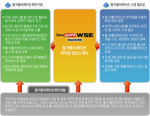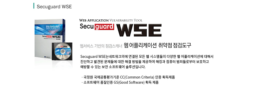 ±¹³»±â¼ú·Î °³¹ßµÈ À¥ ¾îÇø®ÄÉÀÌ¼Ç Ãë¾àÁ¡ Á¡°Ëµµ±¸ Secuguard WSE(Web Application Security Explorer)´Â ³×Æ®¿öÅ©»óÀÇ ´Ù¾çÇÑ À¥ ȯ°æ¿¡ ´ëÇØ¼ °¢Á¾ Worm, DOS ¹× ÇØÅ· °ø°Ý°ú À¥ ¼³Á¤ ¿À·ù µî¿¡ ³ëÃâµÈ Ãë¾àÁ¡µéÀ» Áø´ÜÇϰí, ¹ß°ßµÈ ¹®Á¦µé¿¡ ´ëÇÑ ÇØ°á¹æ¹ýÀ» Á¦°øÇÏ¿© ÇØÅ·°ú ÄÄÇ»ÅÍ ¹üÁ˵é·ÎºÎÅÍ º¸È£ÇÏ°í ¿¹¹æÇÒ ¼ö ÀÖ´Â º¸¾È ¼ÒÇÁÆ®¿þ¾î ¼Ö·ç¼ÇÀÔ´Ï´Ù.